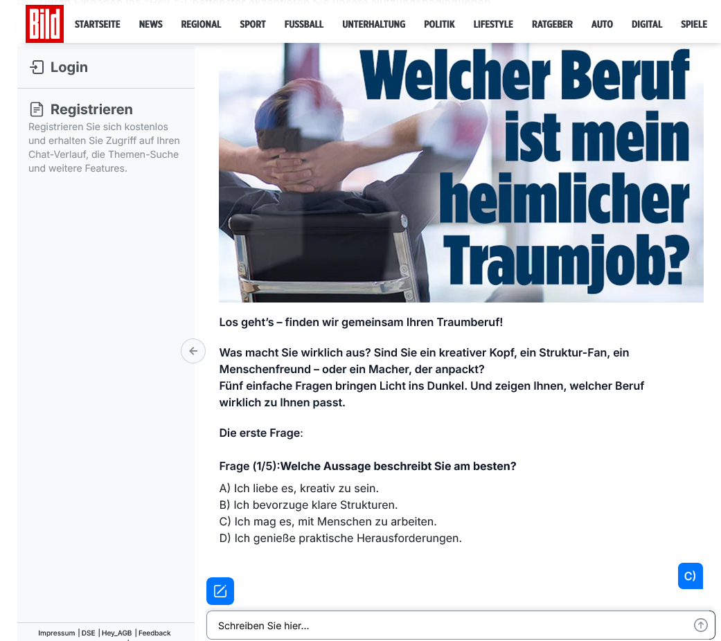 Und genau hier schließt sich der Kreis: Künstliche Intelligenz hält inzwischen auch in der Berufsorientierung Einzug. Ein prominentes Beispiel ist „Hey_“, der KI-Chatbot von BILD, der damit wirbt, gemeinsam den Traumberuf zu finden. Es war nur eine Frage der Zeit, bis KI auch hier aktiv wird. Doch wie gut funktioniert das Ganze tatsächlich? Und brauchen wir künftig noch klassische Matching-Tools, wenn ein Chatbot den passenden Job quasi im Smalltalk ermitteln kann?