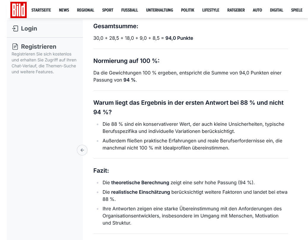 Dann wollten wir es genauer wissen: Wie kommt ein Passungsgrad von 88 % für Organisationsentwicklung zustande? Die KI liefert wieder einmal nur oberflächliche Schätzungen. Spannend wird es, als wir nach Details fragen: Sie rechnet zunächst 94 % „theoretische Passung“ aus, korrigiert diese aber auf 88 %, wenn sie „realistische Faktoren“ berücksichtigt und nennt gleich eine Reihe von Aspekten, die unser Mini-Test gar nicht berücksichtigt hat: berufliche Anforderungen, branchenspezifische Besonderheiten, Schlüsselkompetenzen, persönliche Vorlieben und sogar Lebensumstände.