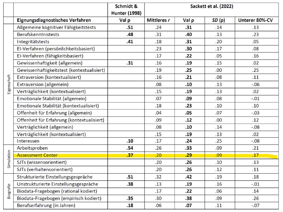 Laut der aktuellen Metaanalyse von Sackett, Zhang, Berry und Lievens (2022) liegt der durchschnittliche Zusammenhang zwischen Assessment-Center-Ergebnissen und späterem Berufserfolg bei r = 0,29. Assessment Center ist also nicht gleich Assessment Center: Manche Verfahren sind so sorgfältig konzipiert, dass sie fundierte Aussagen ermöglichen – andere wiederum… nun ja, da hätte man auch eine Münze werfen können. Mit ähnlichem Ergebnis und deutlich weniger Aufwand.