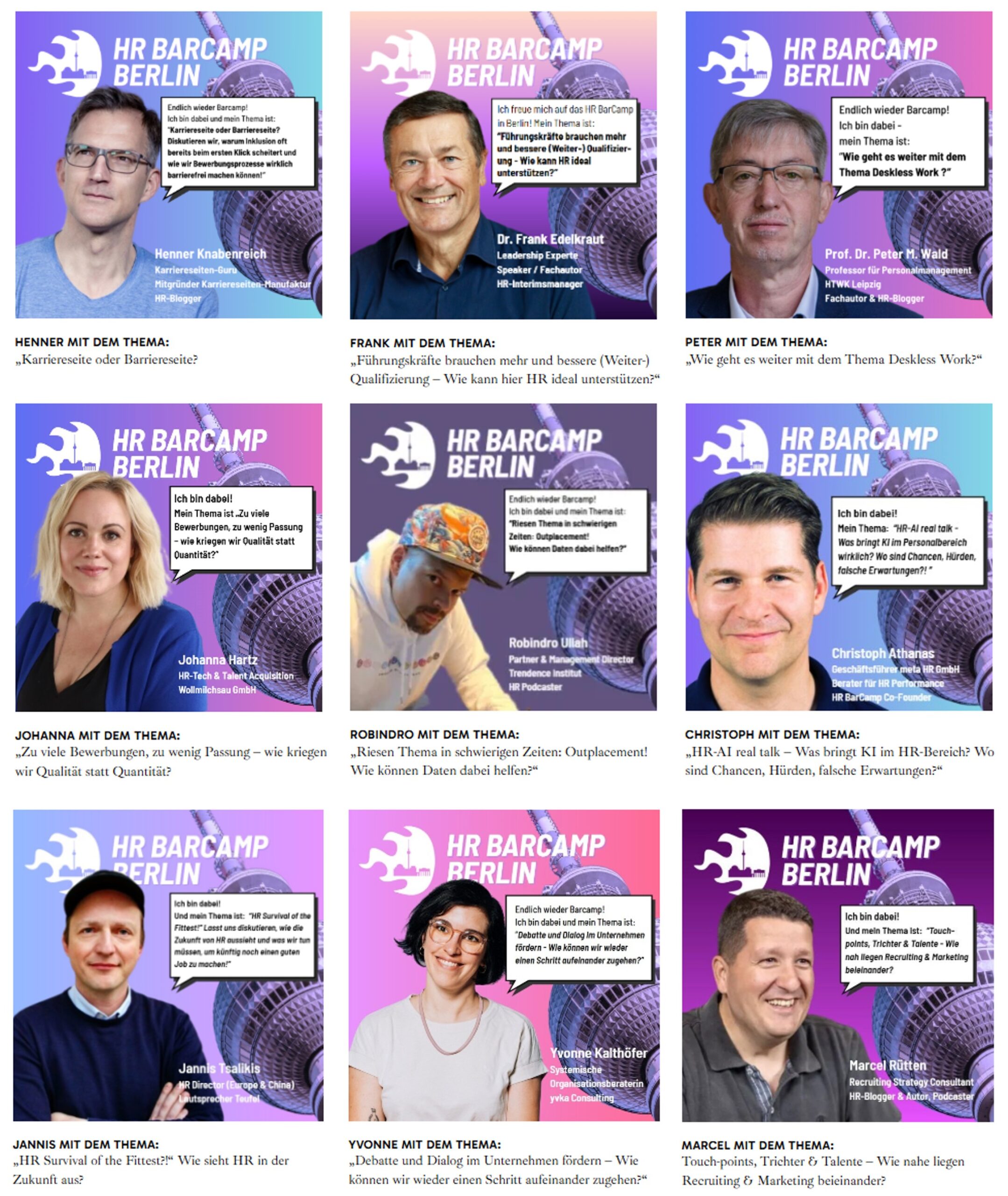 Das HR Barcamp ist damit so etwas wie der „Stammvater“ aller HR-Unconferences… Denn hier gilt: Das Programm bringt man mit. Jeder, der ein bewegendes Thema hat, kann dies dort pitchen und wenn es auch andere interessiert, wird es eine Session. Das bringt insg. sehr viel Ehrlichkeit in die Themen.